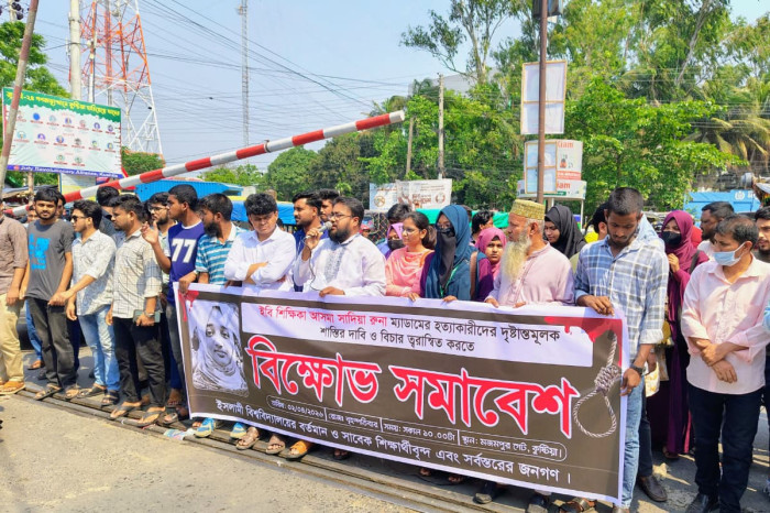 ইসলামী বিশ্ববিদ্যালয়ের (ইবি) সমাজকল্যাণ বিভাগের সহযোগী অধ্যাপক আসমা সাদিয়া রুনা হত্যার বিচারের দাবিতে কুষ্টিয়া মহাসড়ক অবরোধ ও পুলিশ সুপারের কার্যালয় ঘেরাও করে বিক্ষোভ সমাবেশ করেছে বিভাগের শিক্ষার্থীসহ নিহতের পরিবার।