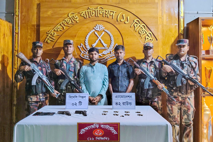 বান্দরবানের নাইক্ষ্যংছড়িতে বর্ডার গার্ড বাংলাদেশ (বিজিবি)-এর বিশেষ অভিযানে দুটি পিস্তল ও ৪২ রাউন্ড গুলিসহ এক রোহিঙ্গা যুবকসহ দুইজনকে আটক করা হয়েছে।