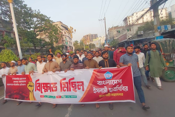এর আগে, বিকেল ৫টায় নগরীর যাদুঘর মোড় থেকে বিক্ষোভের সূচনা করে শহরের গুরুত্বপূর্ণ সড়কগুলো প্রদক্ষিণ করে সাহেব বাজারের জিরো পয়েন্টে এসে সংক্ষিপ্ত সমাবেশ করেন তারা।