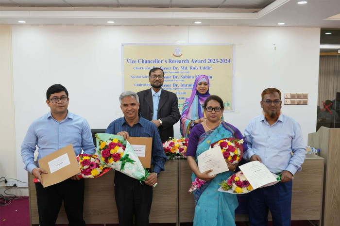 জগন্নাথ বিশ্ববিদ্যালয়ে (জবি) প্রথমবারের মতো গবেষণায় বিশেষ অবদানের স্বীকৃতিস্বরূপ ‘ভাইস চ্যান্সেলর রিসার্চ অ্যাওয়ার্ড’ প্রদান করা হয়েছে। ২০২৩–২০২৪ সেশনের জন্য বিশ্ববিদ্যালয়ের চারটি অনুষদ থেকে চারজন শিক্ষককে এ সম্মাননা দেওয়া হয়।
