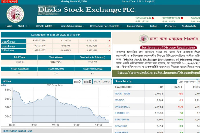 ডিএসই সূত্রে জানা গেছে, দিনশেষে ডিএসই ব্রড ইনডেক্স (ডিএসইএক্স) আগের দিনের তুলনায় ৪১ পয়েন্ট কমে ৫ হাজার ২৩০ পয়েন্টে নেমেছে। ডিএসই শরিয়াহ সূচক ৫ পয়েন্ট কমে ১ হাজার ৬১ পয়েন্টে এবং ডিএসই-৩০ সূচক ১৯ পয়েন্ট কমে ১ হাজার ৯৭৯ পয়েন্টে অবস্থান করছে।
