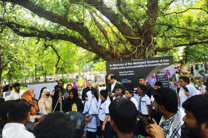 ঢাকা বিশ্ববিদ্যালয়ে অনুষ্ঠিত এই আবেগঘন প্রতিবাদী কর্মসূচিতে মার্কিন-ইসরাইলি হামলায় শহীদ ইরানি শিশুদের প্রতীকী কফিন, রক্তাক্ত স্কুল ব্যাগ ও আলোকচিত্র প্রদর্শন করা হয়। পাশাপাশি যুদ্ধবিরোধী স্বাক্ষর কর্মসূচিরও আয়োজন করা হয়। এতে বিভিন্ন শিক্ষাপ্রতিষ্ঠানের শিক্ষার্থীরা অংশ নিয়ে রক্তভেজা হাতের ছাপ দিয়ে প্রতিবাদ জানান।